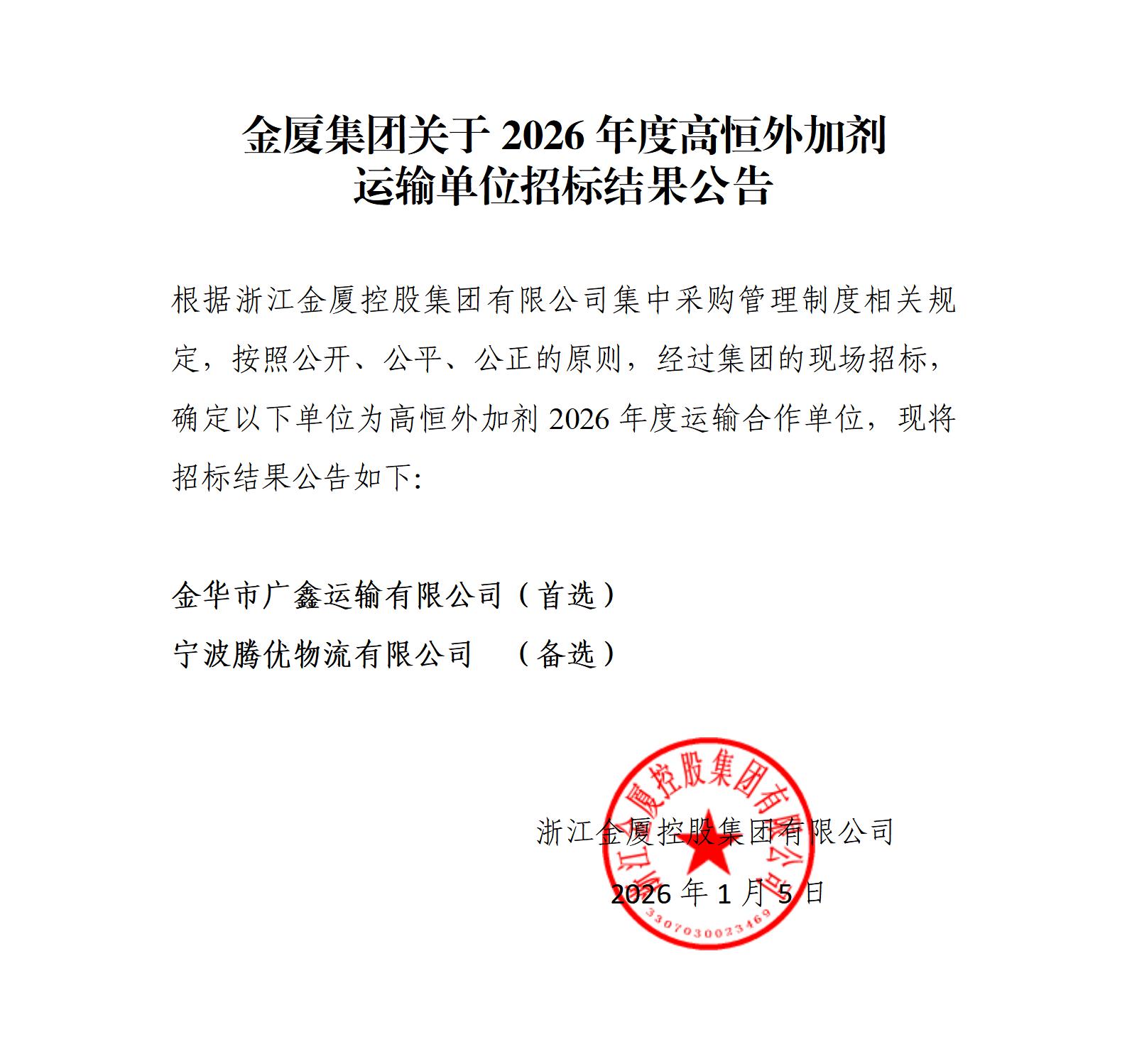 金廈集團(tuán)關(guān)于2026年度高恒外加劑 運輸單位招標(biāo)結(jié)果公告